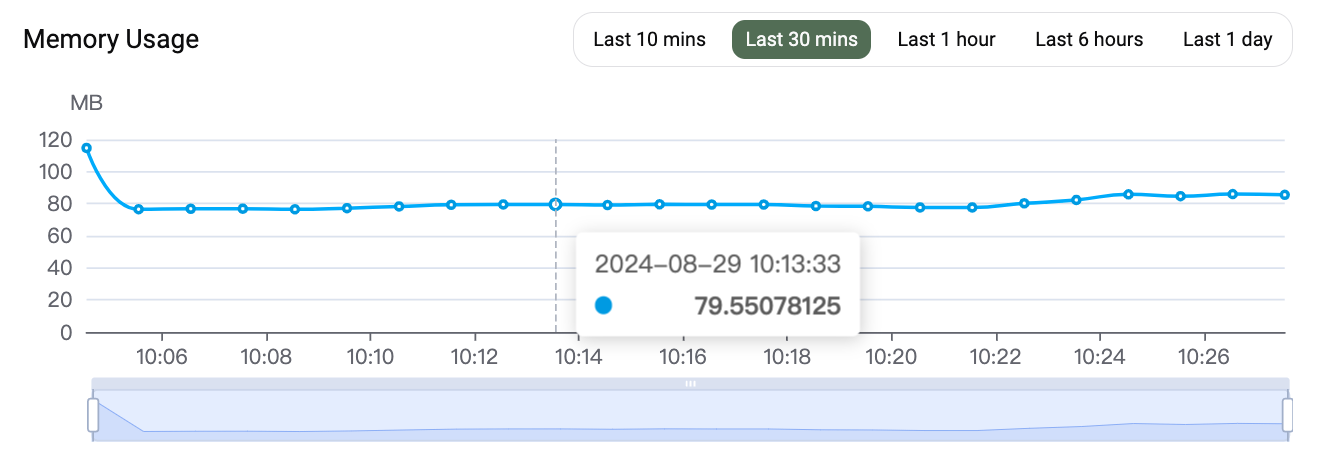The VectorChord Cloud provides several graphs for monitoring system and database metrics. You can access the Metrics dashboard from the cluster details in the VectorChord Cloud Console. Observable metrics include: